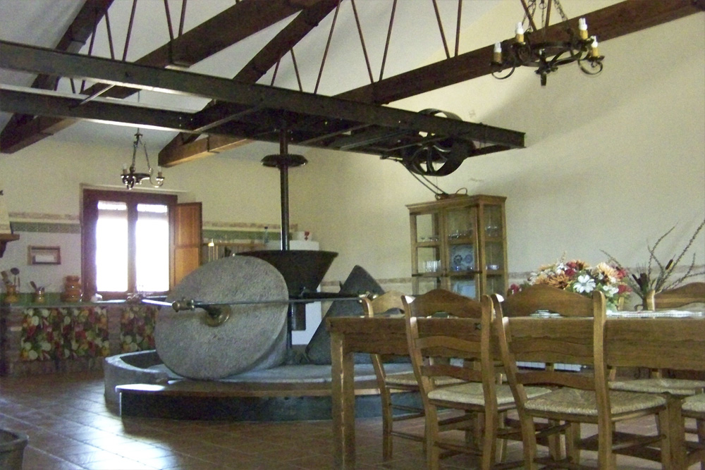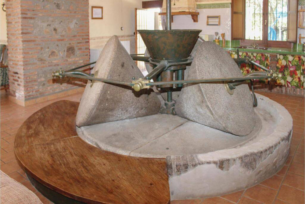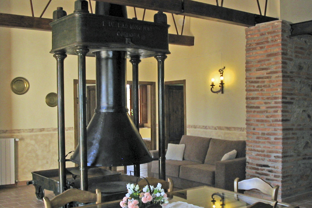Ambas maquinas que en su día sirvieron para extraer el aceite de las aceitunas, hoy sin perder su identidad contribuyen con originalidad para crear un cálido ambiente hogareño y molinero.