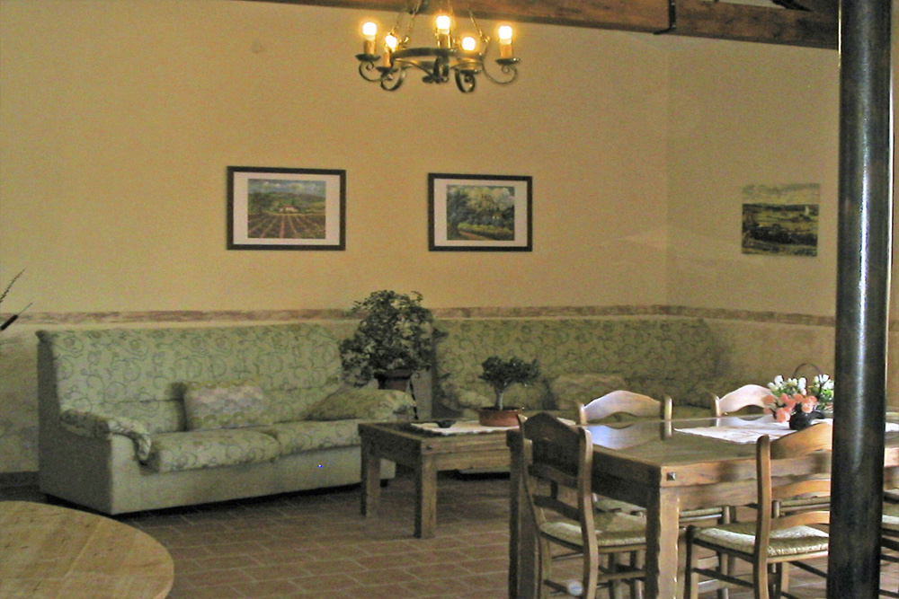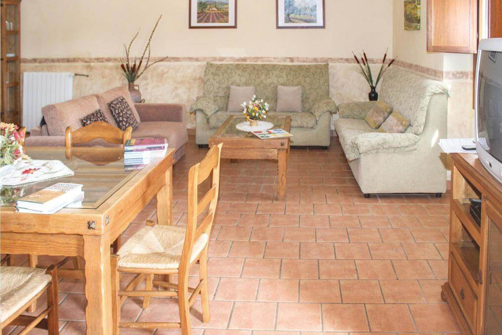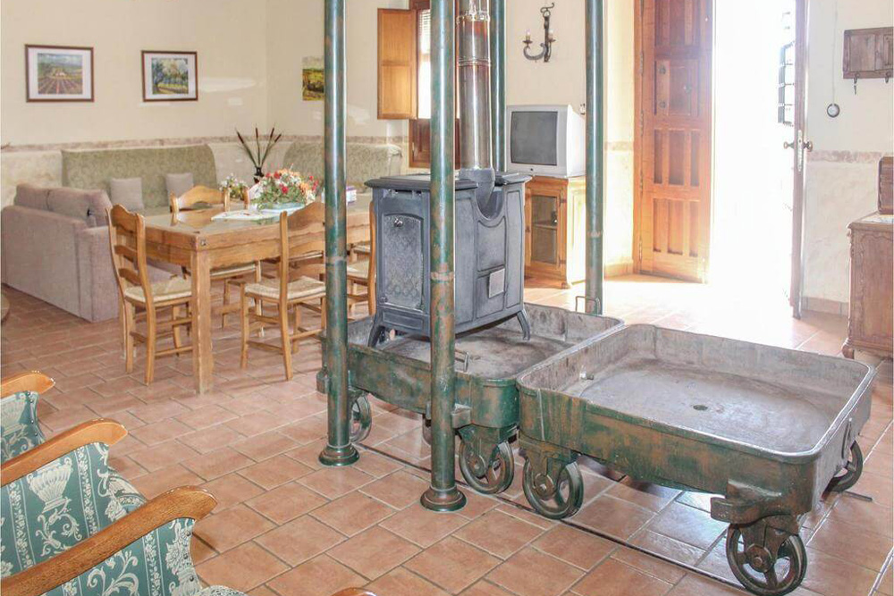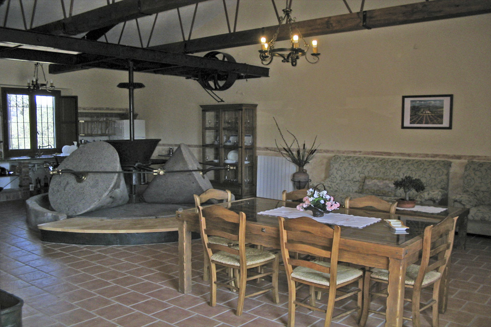 El salón comedor con chimenea está compartido con la cocina.Un patio empedrado donde se ubica una exposición de las antiguas maquinas de extracción de aceite.