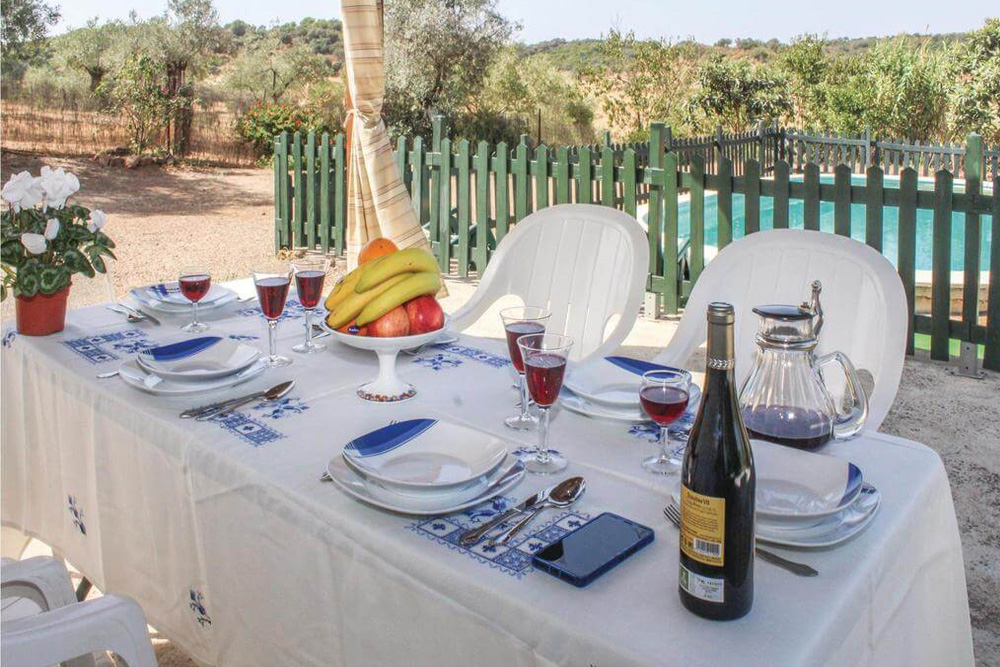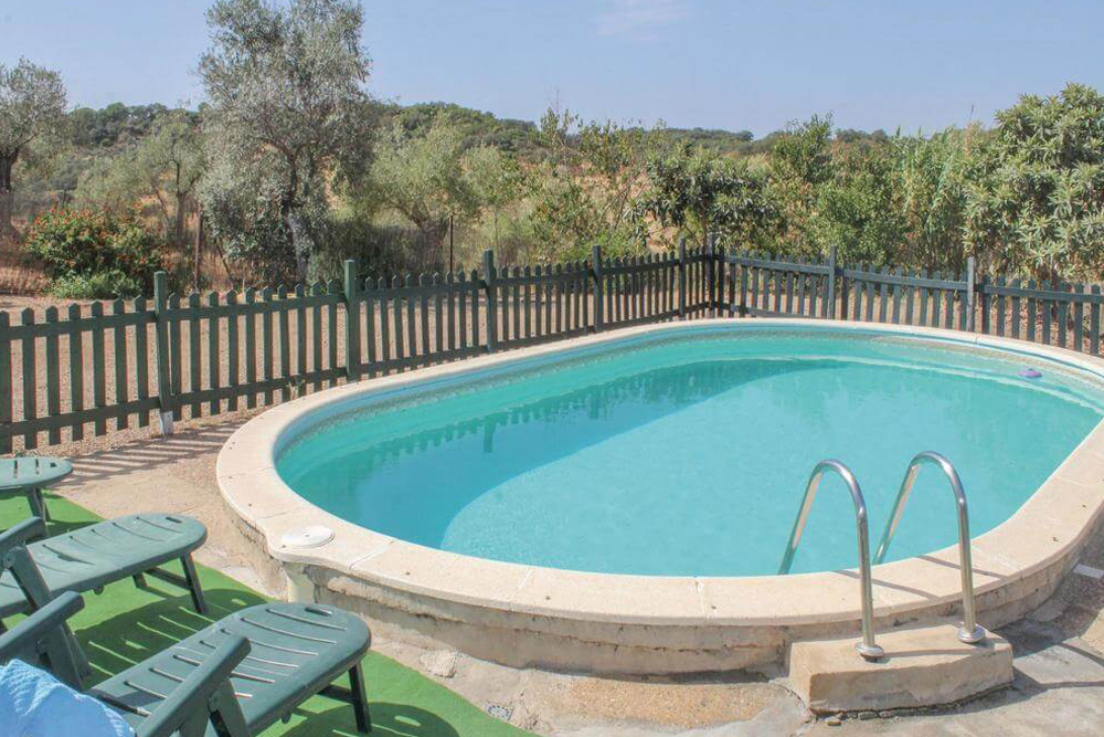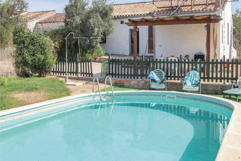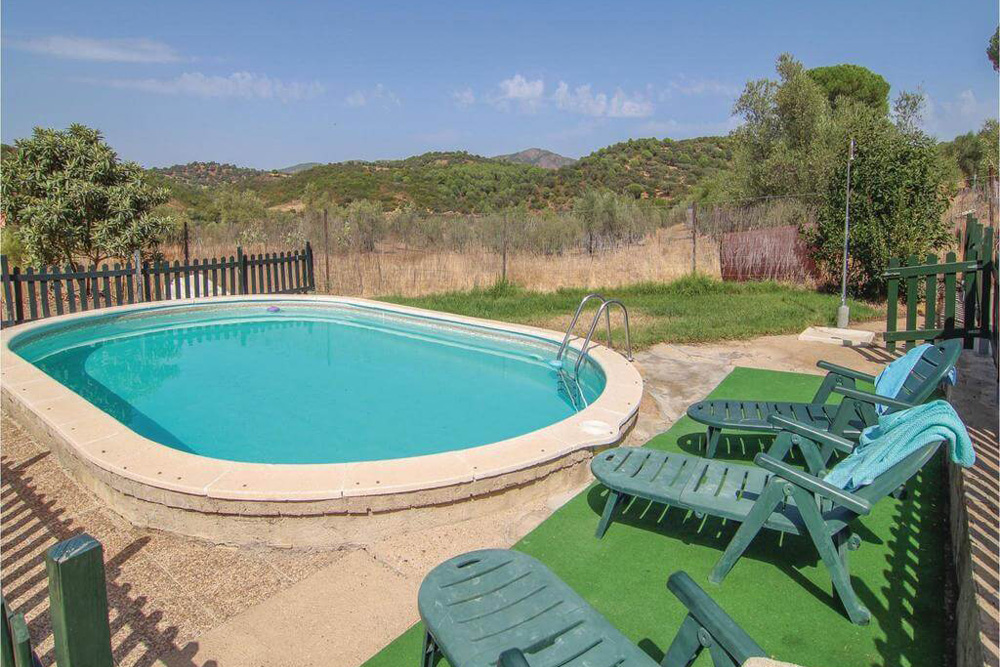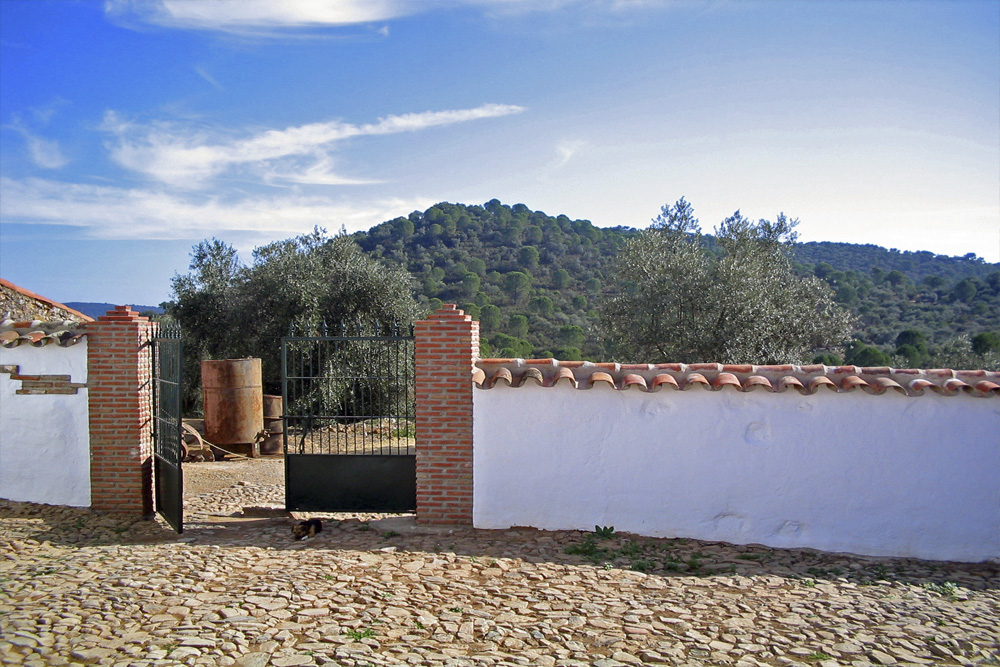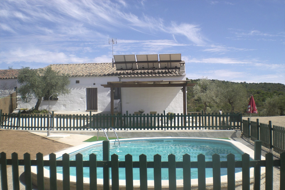 En el exterior se encuentra la piscina,vallada, equipada con depuradora y una barbacoa, con vistas privilegiadas de Valles y Montes de Sierra Morena, con amplios espacios de encinas, pinos, olivos centenarios y vegetación autóctona de Sierra Morena como jaras, romeros y madroños.